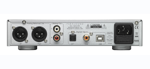 It’s quite obvious from small, slim display which inputs the Parasound has to offer: optical, coaxial and USB. There’s one of each, in addition to a set of balanced and unbalanced analogue outputs.
